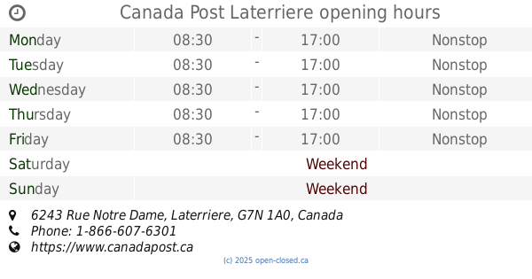 It is also possible to : Edit these OPENING HOURS of Branch Canada Post In Laterriere, 6243 Rue Notre Dame,